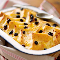 3. Layer half the bread, butter side up, on the bottom of the dish and spoon over the marmalade and half the drained sultanas. Top with the remaining bread, buttered side up. Sprinkle with the remaining sultanas.